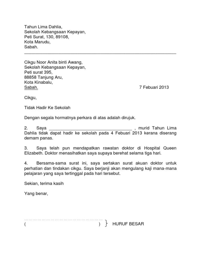 Ada beberapa sebab mengapa murid tidak dapat hadir, antaranya adalah kerana balik pulang ke kampung, cuti sakit, demam dan sakit perut. 82000 pontian, johor darul takzim. ——————————————————— guru darjah 1 cerdik, sekolah menengah mega jaa, 43650 bandar baru bangi, selangor. Contoh surat kiriman rasmi cuti sakit.surat rasmi memohon cuti ini juga sangat berguna bagi pelajar untuk meminta izin tidak datang hadir ke sekolah atas sebab tertentu. Menghadapi masalah pengangkutan ke sekolah.